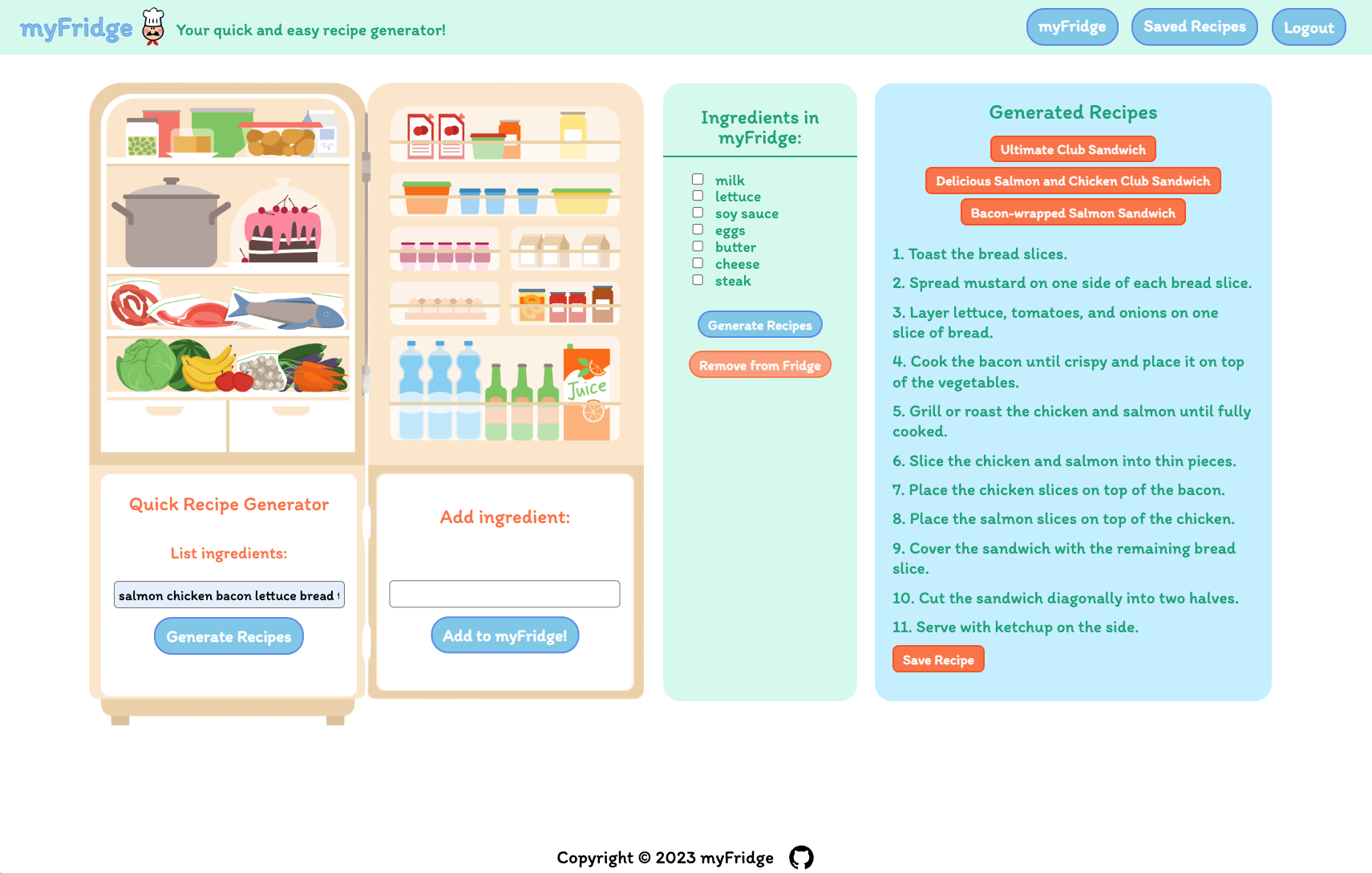 Recipe Generator build on MERN stack with OpenAI api. As project lead of a 4 member team, I hosted Notion task page and coded backend to front end, as well as conceptualizing and pitching original idea. Project features quick recipe generator, saved ingredients, saved recipes with notes as well as user authentication. Completed in 7 days.